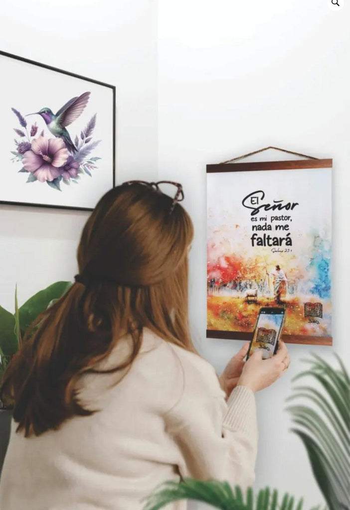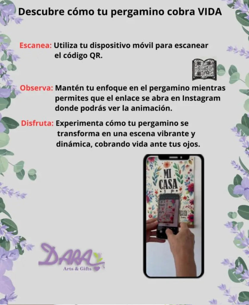 Descubre cómo tu pergamino cobra VIDA 1. Escanea: Utiliza tu dispositivo móvil para escanear el código QR. 2. Observa: Mantén tu enfoque en el pergamino mientras permites que el enlace se abra en Instagram donde podrás ver la animación. 3. Disfruta: Experimenta cómo tu pergamino se transforma en una escena vibrante y dinámica, cobrando vida ante tus ojos. Descripción: Impresión digital a color Cuerda de yute Lienzo 100% polyester Dos piezas de madera pintadas a mano con tinta marrón oscuro. Tamaño: medium (9.84 x 13.78 in / 25 x 35 cm) UPC 641320834809