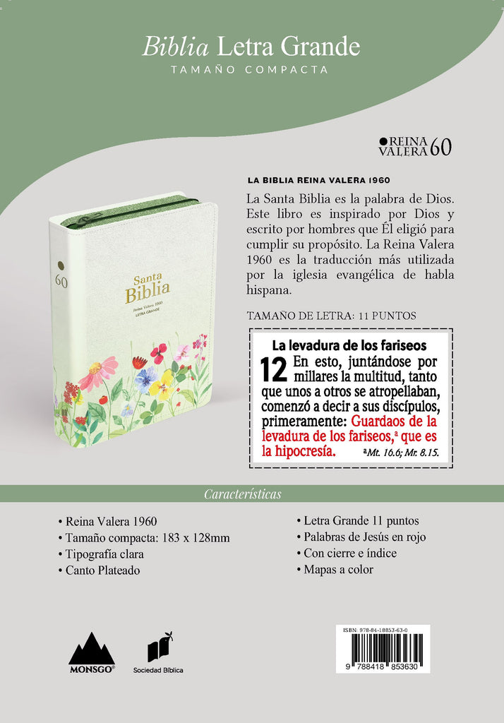 Biblia RVR 1960 Compacta Letra Grande 11 puntos Símil Piel Verde Claro Flores con Cierre y Índice