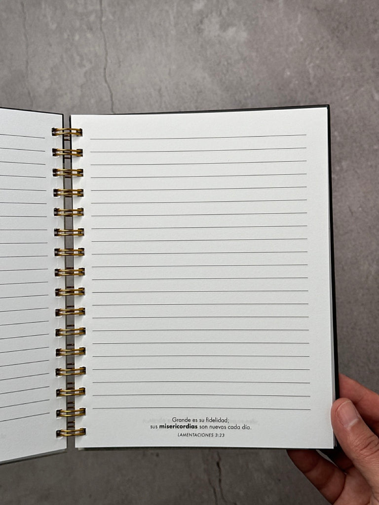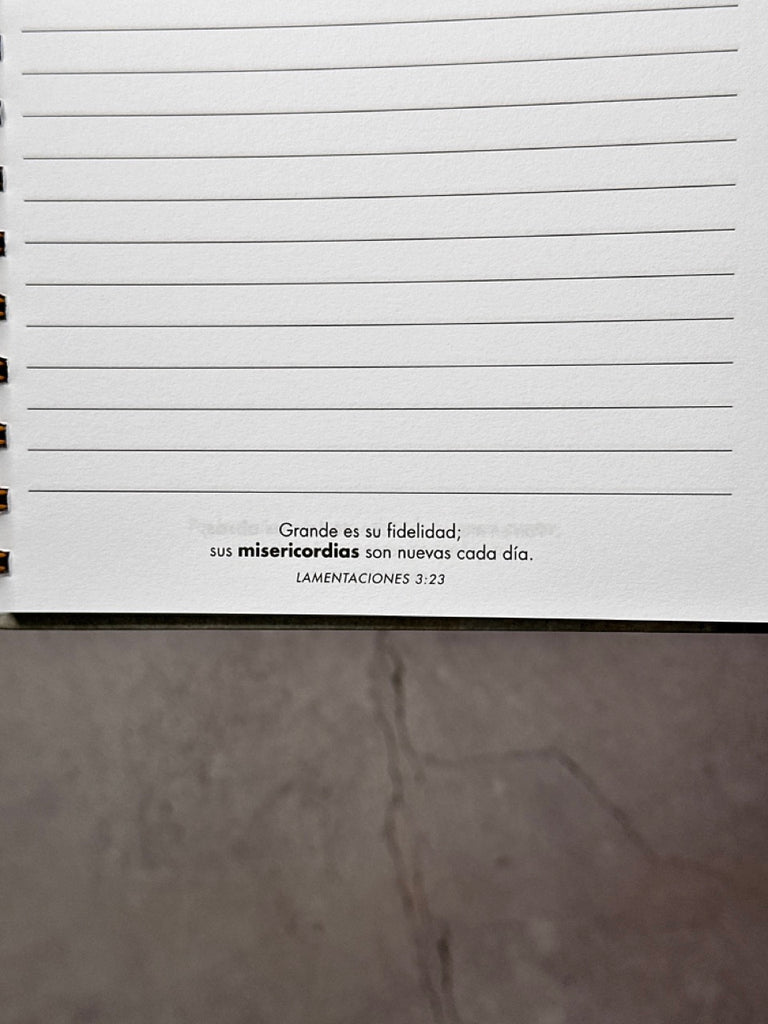 Librera de anillas Tapa Dura. Con efectos en la portada. Versículos en el interior. 192 páginas. Tamaño: 8.4” x 6.4” x 1” (213 x 163 x 25mm)