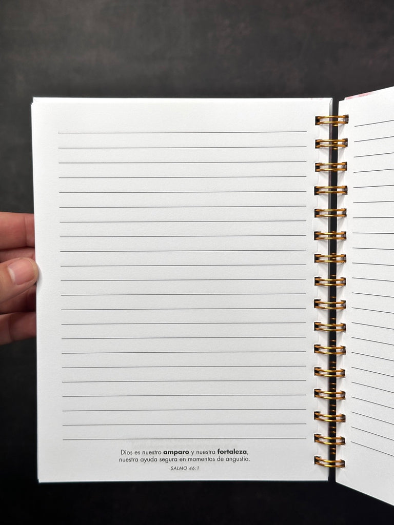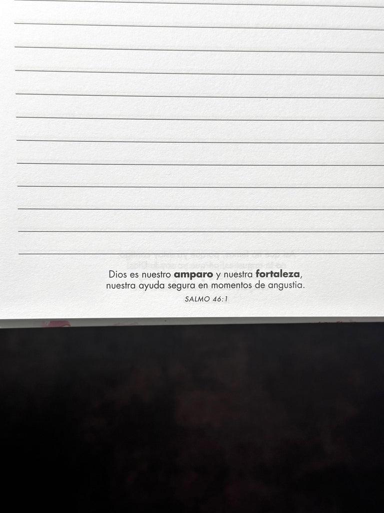 Librera de anillas Tapa Dura. Con efectos en la portada. Versículos en el interior. 192 páginas. Tamaño: 8.4” x 6.4” x 1” (213 x 163 x 25mm)