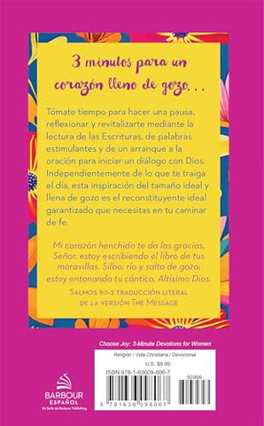 Choose Joy Today!Got 3 minutes to spare? You'll find the spiritual pick-me-up you need in Choose Joy: 3-Minute Devotions for Women. Written especially the twenty-first-century woman, this delightful devotional packs a powerful dose of comfort, encouragement, and joy into just-right-sized readings. Minute 1: scripture to meditate on; Minute 2: a short devotional reading; Minute 3: a prayer to jump-start a conversation with God. This portable package makes a fabulous any-occasion gift for every woman.¡Escoge hoy el gozo!¿Puedes sacar tres minutos? En Escoge el gozo: Devocionales de 3 minutos para mujeres las lectoras encontrarán el reconstituyente espiritual que desean. Escrito de manera especial para la mujer del siglo XXI, este maravilloso devocional contiene una poderosa dosis de consuelo, estímulo y gozo en sus lecturas de tamaño ideal. Primer minuto: versículos en los que meditar; segundo minuto: una breve lectura devocional; tercer minuto: una oración para impulsar una conversación con Dios. Esta manejable presentación es un regalo fantástico para todas las mujeres en cualquier ocasión.